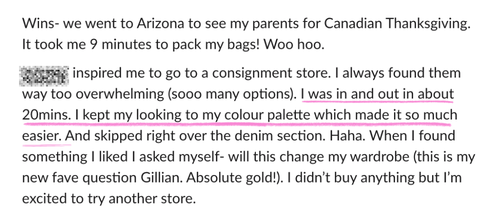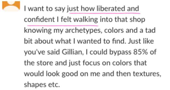 “Do it! A game changer and a must! Getting dressed in the morning was my least favourite part of my morning routine. Staring at my closet full of clothes and trying to piece together an outfit that was “me.” I didn’t know why some outfits never felt complete and why some pieces never really looked good together. Now, when something feels off, I can troubleshoot. It’s so fun now to shop my closet and experiment knowing I don’t have to fit into “one box” or “one style/archetype. Gillian genuinely wants you to explore, try, and for it to be YOUR style. She debunks all the myths and other factors that may have influenced your style in the past!”