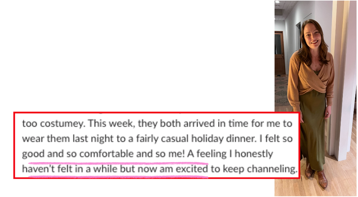 “Gillian totally shifted my mindset about my personal style to something that could be fun, creative, and worth my time. She gave me a framework to make shopping decisions, color & styling choices, and figure out why some of the clothes in my closet never made me feel great...now I feel so much more confident and interested in identifying what WILL make me feel my best, something I never thought I'd say!”